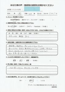 2019年7月5日:ギックリ腰 投稿日: 2019年7月5日2019年7月5日 投稿者: makoto メニューをお選びください 脳反射刺激療法・フットケア 誠整骨院を選んで頂いた理由を教えてください 知人からの紹介 当院に来院された理由(症状)はなんですか? ギックリ腰 当院の施術・治療を受けられた感想を教えてください 腰痛はすっかり改善されました。 つかれにくい体にもなってきていると思うので、助かっています。 どんな方に当院を紹介したいですか? 家族・友人 同じ理由(症状)で悩んでいる方に一言 一度受診されてみて下さい